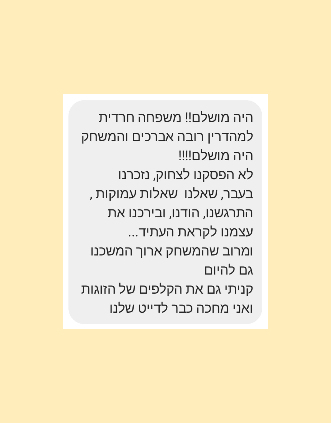 משחק השאלות שיעיף כל ערב, מפגש או אירוע באוויר, ישדרג לכם את הדייט, או את ארוחת השישי המשפחתית, תלוי איזו ערכת משחק תבחרו שתגיע אליכם עד הבית – לנו יש ערכה לכל מטרה שתבחרו כדי לשבור שגרה עם ערב מצחיק, מרגש, קליל, אינטימי, והכי פתוח שיש.