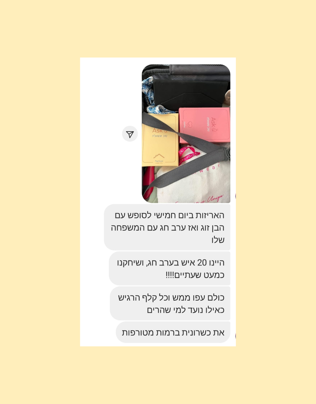 בכל ערכה 50/100 שאלות וכל כך הרבה חוויות מחכות לכם בקלפים האלה, שמגיעים מתוך הלב שלנו אליכם.